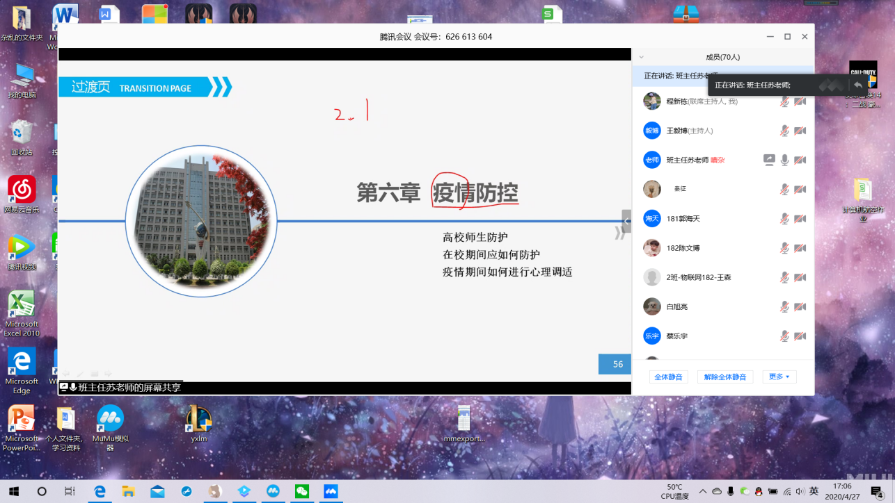 beat365中文官方网站根据学校相关要求,制定了关于组织开展《2020年春季返校复学第一课》线上主题班会的实施方案,学院所有班级通过腾讯会议、QQ群课堂、腾讯课堂等线上平台于4月23日至5月7日全部完成了线上主题班会的学习和教育。