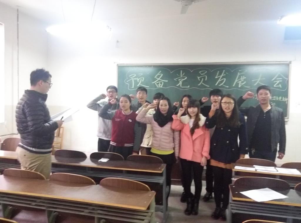 十位同学依次上台就自己一年来的表现做思想汇报,表示会时刻与党中央保持一致,拥护党的纲领,遵守党的章程,履行党员义务,执行党的决定,对党忠诚。随后培养人分别介绍发展对象的现实表现,经党支部大会讨论,投票表决,十位同学光荣地成为中国共产党预备党员。在严肃的入党宣誓中会议正式落幕。
