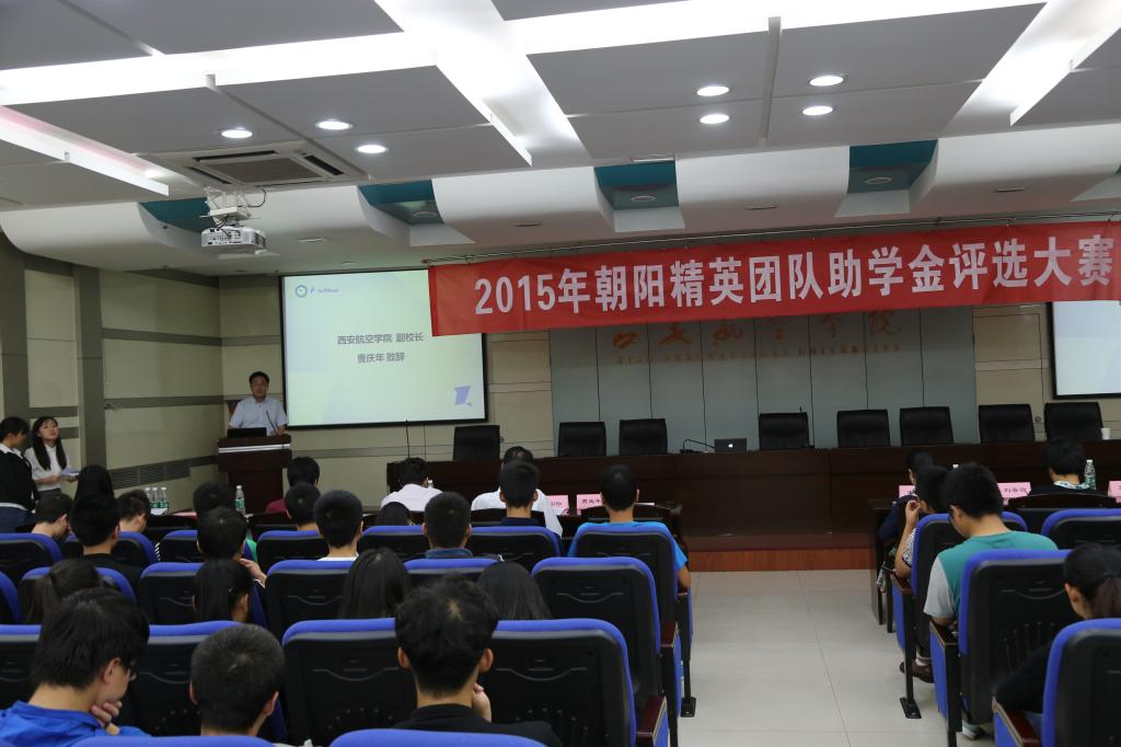 西安丝路软件有限公司副总经理王莺女士讲话,表示对校企合作班学生的朝阳精英团队助学金评选大赛路演的期待,提出了对全体同学的寄语。教务处米国际处长介绍了“互联网+创新创业”大赛的情况,并通报了我校获奖情况:由我院石锋老师带领的学生获得了该项大赛的省级铜奖。