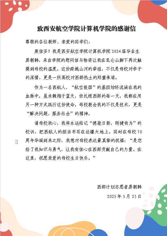 易朝韩在回信中说:作为一名西航人,“航空报国”的基因始终流淌在我的血脉中。虽未翱翔于蓝天,但扎根西部的每一天,我都在用另一种方式践行这份使命。母校教会我的不仅是技术,更是“解决问题、服务社会”的精神。
