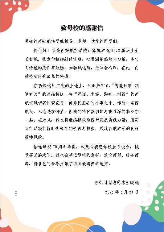 王璇妮在回信中说:服务期间,始终牢记“德能日新 刚健有为”的西航校训,将“严谨、求实、勤奋、创新”的西航校风切实体现在每一件为民服务的小事之中。