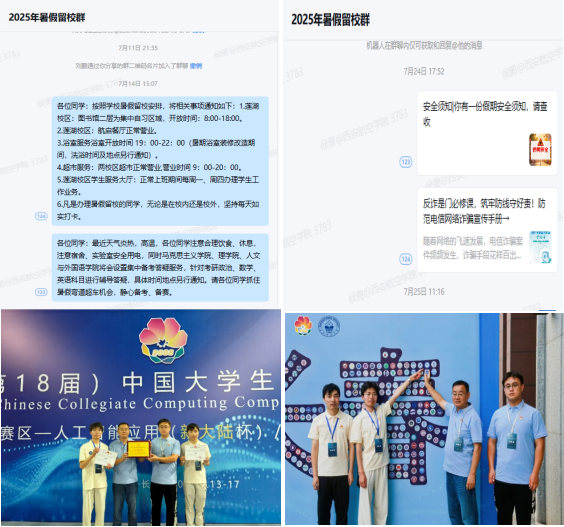 为保障留校学生的学习、科研与生活需求,学院高度重视暑期留校学生管理工作。学院领导班子制定详细管理方案,明确责任分工,严格执行留校申请审批制度,精准掌握留校学生动态信息。建立“辅导员-导师-学生”联动管理机制,通过利用企业微信智能打卡和定期走访学生宿舍、实验室等方式,常态化开展安全宣传教育,切实筑牢安全防线。同时,学院教师为备战学科竞赛、参与科研项目、准备考研深造的学生提供指导和支持,让留校学生感受到学院的关怀与温暖,确保了暑期校园的和谐稳定。经过暑假备赛和努力,在仇小鹏、刘超老师指导下,钟佳彬,苏易晗,石涛等同学荣获第十八届中国大学生计算机设计大赛总决赛二等奖。
